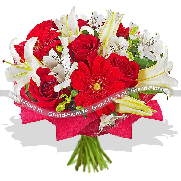 Восхищались ли вы когда-нибудь грациозностью, нежностью и трогательностью лебедей? Именно такие смешанные чувства вызывает этот чудесный букет. Дизайнеры-флористы добавили к красной гербере розу в тон и разбавили белыми лилиями — получилась сказочная красота.