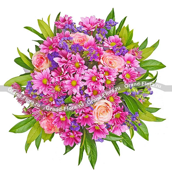 Хризантема кустовая фиолетовая - 15 шт., роза розовая - 11 шт., статица - 7 шт., салал,  фетр фиолетовый, бант.