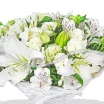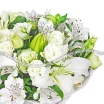 ЛЮКС: лилия белая - 3 шт., кустовая роза белая (возможна замена на кремовую) - 4 шт., эустома белая - 2 шт., альстромерия белая - 2 шт., упаковка.