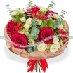 (на фото) роза красная - 5 шт., роза кремовая кустовая - 4 шт., эвкалипт - 3 шт., гиперикум - 2 шт., упаковка, лента. Примерный размер: 25Х25 см.