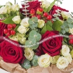 роза красная - 11 шт., роза кремовая кустовая - 10 шт., эвкалипт - 5 шт., гиперикум - 4 шт., упаковка, лента. Примерный размер: 45Х45 см.