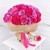 Люкс: гвоздика малиновая - 7 шт., роза розовая - 8 шт., хризантема кустовая фиолетовая - 6 шт., упаковка, лента. Примерный размер: 40Х40 см.
