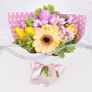 Уменьшенный: гербера желтая - 1 шт., тюльпан желтый - 3 шт., тюльпан розовый - 1 шт., хризантема кустовая фиолетовая - 2 шт., декоративная зелень, упаковка, лента.