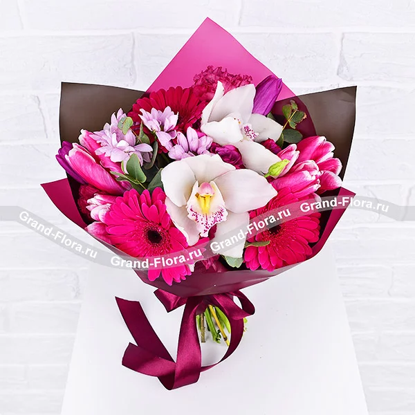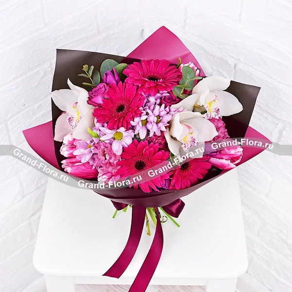 Стандартный: орхидея белая - 2 шт., гербера малиновая - 3 шт., хризантема кустовая розовая - 2 шт., эустома розовая - 3 шт., тюльпан розовый - 3 шт., тюльпан фиолетовый - 2 шт., роза кустовая фиолетовая - 2 шт., эвкалипт, упаковка, лента. Примерный размер: 30Х30 см. (тюльпаны не в сезон заменяются на розы, эустому или альстромерии в зависимости от свежей поставки)