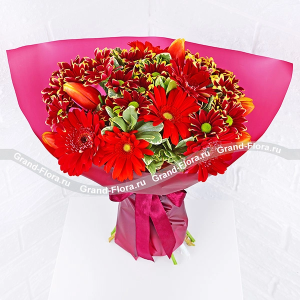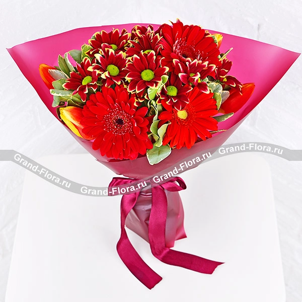 Стандартный: гербера красная - 4 шт., тюльпан красно-оранжевый - 6 шт., хризантема кустовая ромашковая бардовая - 3 шт., упаковка, лента.