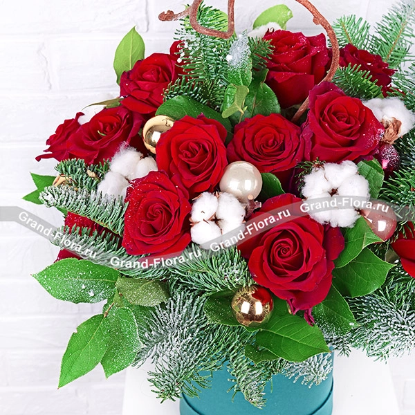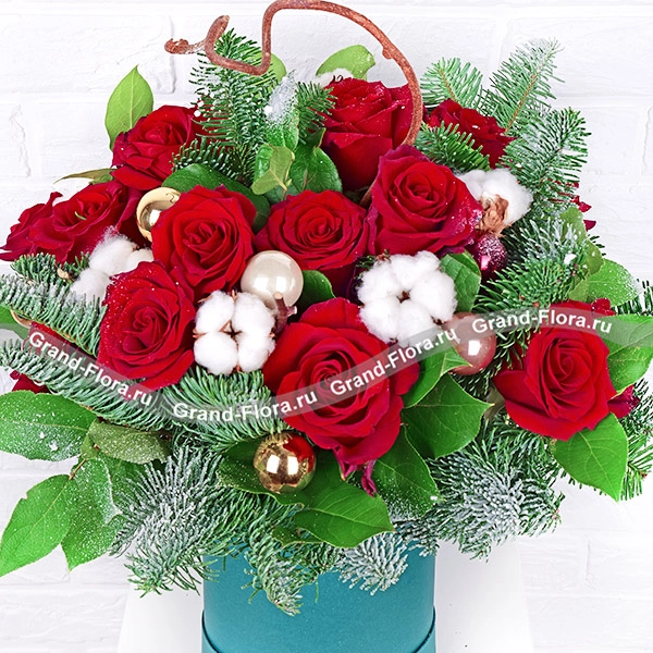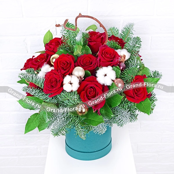 Стандартный: роза красная - 7 шт., хлопок - 3 шт., шарики - 2 шт., декоративная зелень, ель, декор, оазис, коробка.