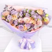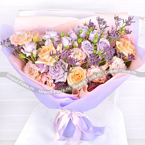 Чарующие и необыкновенные розы сиреневого и кремового  оттенка, розовая эустома и фиолетовый лимониум в букете выглядят гармонично, роскошно и привлекательно.