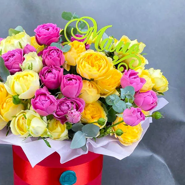 Стандартный: роза кустовая желтая (кремовая) - 6 шт., роза кустовая розовая - 5 шт., декоративная зелень, оазис, топпер "Маме", коробка.